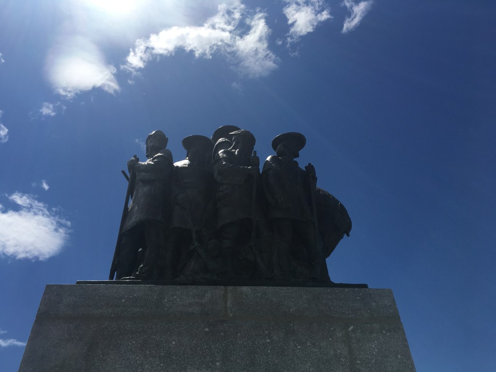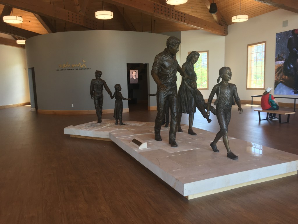 First of all, I parked and went into the Pioneer Center, which was huge and spacious- a new addition to the Park it seemed, with a few exhibit space talking about the building of the “This is the Place” Monument- a big honkin’ tower with the likeness of Brigham Young, Herber C. Kimball, and Wilford Woodruff on the top and a whole crew of others in both statue and relief around the base. The Monument can be viewed (along with its outstanding backdrop looking over the Salt Lake Valley) through a huge floor to ceiling window in the Pioneer Center. Near that window is a collection of statues that display and evoke the feeling of moving from the past into the present and future, with two young pioneer children reaching their hands out to a modern day child and her family moving toward the monument. This was my first interaction with the really interesting and numerous statuary at the park.