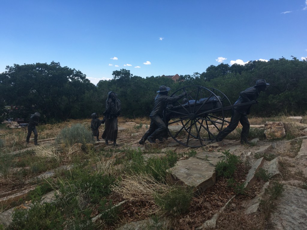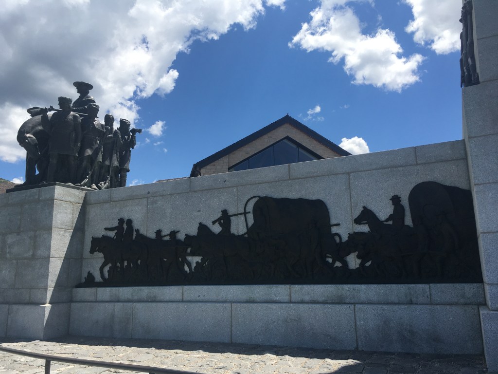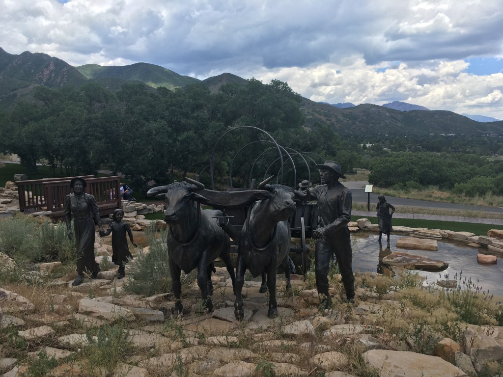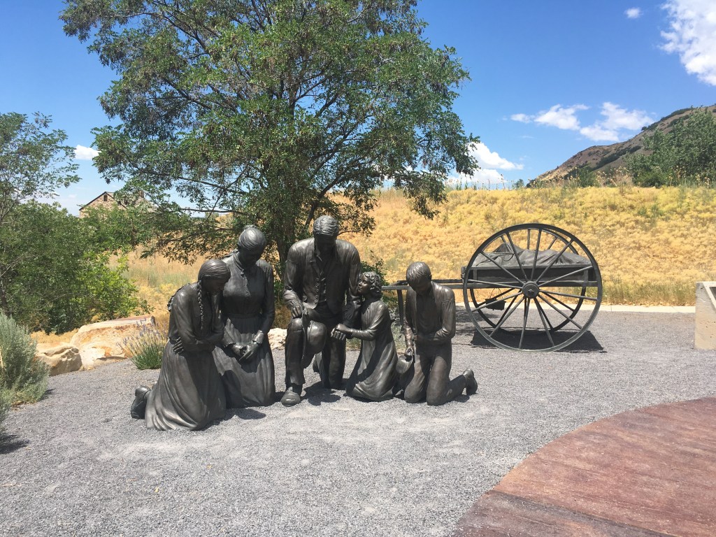 Near that gold panning frenzy was a path that led to a big patch of artificial grass with a few larger than life statues of two parents and three children praying. When I first walked up, a whole gaggle of adults and teens were climbing all over the reverent statues, laughing and shouting, getting a group picture then hopping off and walking away. The statue, which also included a larger than life handcart nearby, was called “Journey’s End” and was associated with a few plaques talking about the trials of a later group of Saints that, after spending most of their money sailing to the United States from Southern and Eastern Europe, couldn’t afford to get oxen and covered wagons so they had to push and pull large two wheeled carts (handcarts) across the United States all the way to Utah. Handcart companies traveled to Salt Lake from 1856 to 1860 and over the course of the travels, according to LDS plaques at the site, about 250 people died, many due to surprise snow storms or other mishaps, while about 2,900 people did make it. The handcart journeys got a bad rap from all the people dying en route- one party that is highlighted later on in the trail for instance, the Martin party, lost 250 people out of 900 according to some accounts, largely due to winter conditions encountered on the trail when the party left in August when they should have left in May or June to beat the winter weather, greatly miscalculated travel times, and inadequate supply stops along the route.